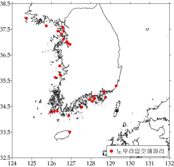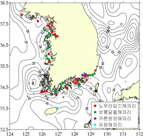○ 보름달물해파리(약독성) - 경남 연근해 등 39곳 출현, 일부해역 밀집출현 ‧ 인천 강화도/소야도 연안 소량 출현 ‧ 경기 평택항/도리도/행락곡 연안 소량 출현 ‧ 충남 난지도/안면도/서산/삽시도/당진/ 고파도 연안 소량 출현 ‧ 전북 십이동파도/말도/무녀도/연도 연안 밀집 출현 ‧ 전남 득량만/신지도/약산도/거금도/나로도 /진도 연안 밀집 출현 ‧ 경남 행암만/잠도/진동만/창원원전 연안 밀집 출현 ‧ 부산 가덕도/해운대/영도 연안 소량 출현 - 수온: 평균 24.10℃(범위: 21.49 ~ 27.07℃) - 출현률: 8/13(52.9%) → 8/20(47.5%) → 8/27(33.9%)