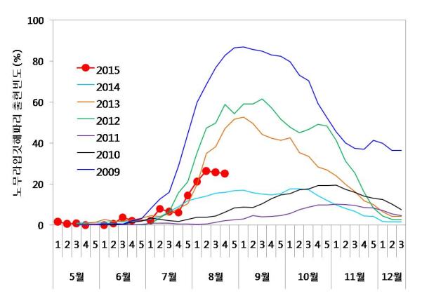 ※ 태풍 15호 고니로 인하여 동해 대다수 어업인 모니터링요원의 예찰 불가로 소수요원 관찰에 의거한 해파리 출현률은 다소 과소평가됨. ※ 1. 수온은 8.21∼8.27일 사이 위성으로부터 관측된 표층수온 자료를 분석한 값임. 2. 출현률은 이번 주 어업인모니터링요원 응답자(115명) 중 해파리를 관찰한 사람 수를 백분율화한 값으로 대량출현의 판단근거로 이용 될 수 없음. □ 조치사항 ○ 미기록 또는 맹독성 해파리의 출현 및 어업피해 발생 시 즉시 통보 ○ 전남 득량만 및 경남 전해역 보름달물해파리 주의보 발령에 따른 해파리모니터링 및 제거작업 수행 ○ 붙임 5. “표류부이 이동궤적”을 참조하여 연근해 접근시 해파리 모니터링 강화 ※ 표류부이는 노무라입깃해파리의 이동을 추정하기 위한 기기로서 노무라입깃해파리의 대표적 서식수심인 5m에 투하하여 그 수심의 해류를 따라 이동함 ※ 표류부이의 자료는 노무라입깃해파리의 이동을 유추하는데 사용 되며 실측 자료와는 다를 수 있음 □ 금후전망 ○ 노무라입깃해파리 출현률 증가 ○ 노무라입깃해파리 및 보름달물해파리 연안 해역 밀집출현 가능 붙임 1. 각 지역별 해파리 출현률(%)