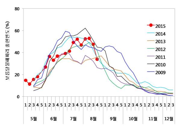 붙임 4. 노무라입깃해파리와 보름달물해파리의 출현빈도 연변동 <노무라입깃해파리><보름달물해파리>