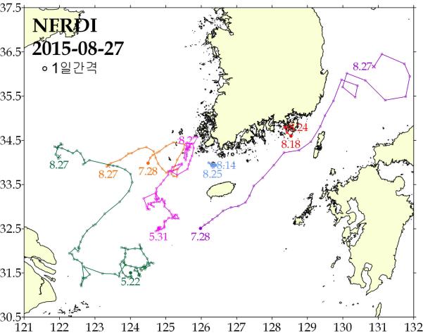 붙임 5. 표류부이 이동궤적 <동중국해 투하(수심 5m) 후, 8월 27일 현재까지의 표류부이 이동궤적> |