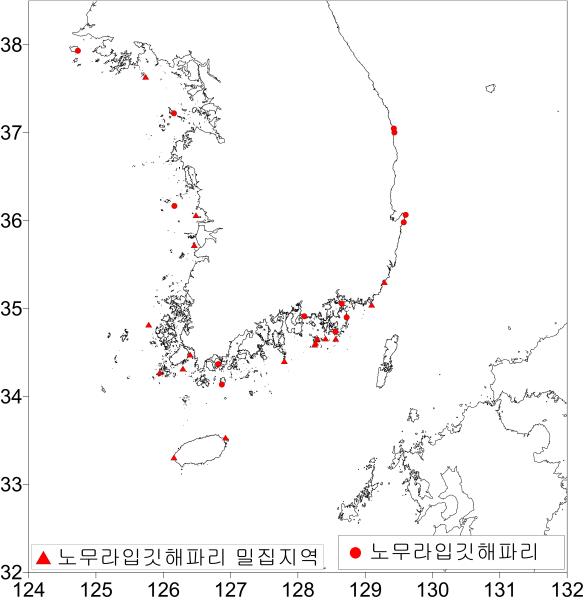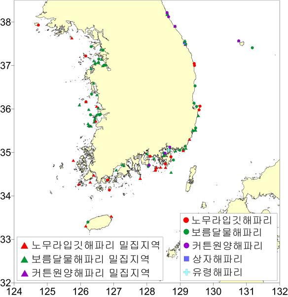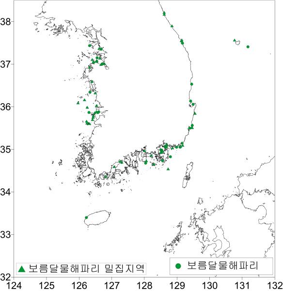 • 인천/전북/전남/경남/부산/제주 일부해역 밀집 출현 - 인천 연평도 연안 - 전북 군산 개야도/비안도 연안 - 전남 진도/여수 소리도/목포 연안 - 경남 욕지도/거제도/매몰도 연안 - 부산 고리원자력/생도 연안 - 제주 차귀도/종달리 연안 • 저밀도 출현 해역 - 인천 소야도/백령도 연안 - 충남 외연도 연안 - 전남 완도/신지면 연안 - 경남 창원/옥포/고성 하이면 연안 - 경북 울진/포항/구룡포 연안