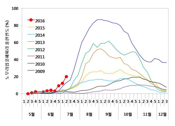 • 인천/경기/충남/전북/전남/경남 /부산/경북/강원 일부해역 밀집 출현 - 인천 송도 연안 - 경기 평택/백미리/국화도/풍도 연안 - 충남 보령/당진/서산 고파도 연안 - 전북 군산 십이동파도/야미도/위도 /무녀도/비안도/개야도/어청도 /새만금 연안 - 전남 보성/고흥/장흥 득량만 - 경남 창원/사천/행암만/사랑도/잠도 욕지도/가조도/죽림만/가조도 연안 - 부산 영도/해운대/오륙도/가덕도 연안 - 울산 동구/주전 연안 - 경북 감포 연안 - 강원 목포/주문진/속초/양양 연안 • 출현률: 6/30(59.33%) → 7/7(46.26%)→ 7/14(53.1%)