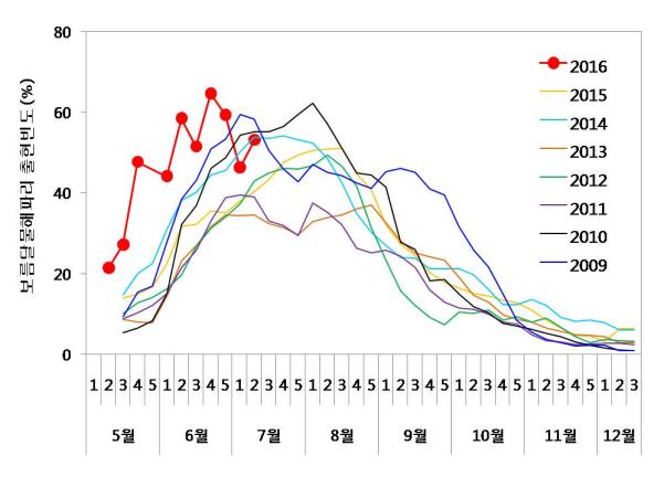 ※ 출현률은 이번 주 조사된 393명 중 응답자 186명에서 해파리를 관찰한 사람 수를 백분율화한 값으로 참고 할 수는 있으나 대량 출현의 결정적 판단 근거로 이용 될 수 없음.