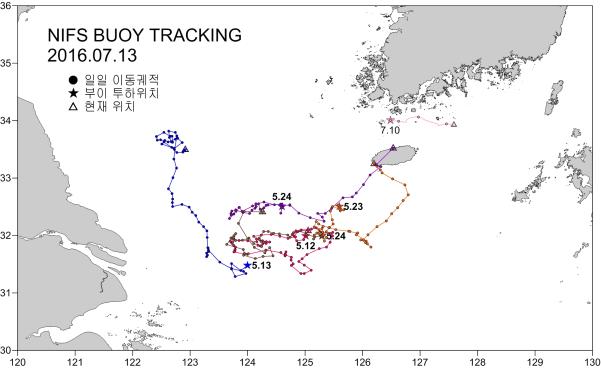 □ 조치사항 ○ 국립수산과학원은 2016년 5월 12일부터 노무라입깃해파리가 출현한 동중국해 특정점에 위성추적 표류부이를 투하하여 시간별 물흐름을 추적하고 있습니다. 해파리의 이동경로에 참고자료로 활용하고 있습니다(붙임 5.).