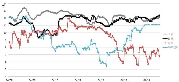 ◦ 국립수산과학원에서 설치 운영하고 있는 실시간 해양환경 어장정보시스템 자료의 분석 결과, 동해 중부해역 (고성, 양양, 삼척)에서의 최근 수온 변동 경향은 아래와 같음 (4월 8일∼4월 14일). ◦ 현재(4월 14일), 고성과 양양 부근에서는 11∼12℃ 의 평이한 수온변동을 보이나, 삼척 수온은 7℃ 내외로 저수온 현상을 보임. 이는 4월 12일에 비하여 3∼4℃ 하강변동을 보임. 한편, 작년 같은 시기 삼척 수온 11℃ 에 비해 4℃ 낮음. ◦ 삼척 주변의 수온 급상승 또는 급하강에 주의하여 주시기 바랍니다.