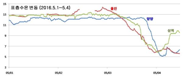◦ 국립수산과학원의 실시간 해양환경 어장정보시스템 자료 및 한국수력원자력의 해양관측부이의 분석 결과, 동해 연안의 양양, 삼척 및 울진에서의 최근 수온 변동 경향은 아래와 같음 (5월 1일∼5월 4일). ◦ 현재(5월 4일), 양양과 울진은 6℃ 내외, 삼척은 9℃ 내외의 수온 분포를 나타내고 있어 전일에 비하여 4∼7℃ 수온이 하강하였음. ◦ 이와 같은 저수온 발생의 원인은 5월 3∼4일 동해를 통과한 강력한 저기압(중심기압 980Hpa 이하)에 기인한 강풍에 의한 연직혼합으로 판단되며, 저기압 통과 이후에도 수일간 저수온이 지속될 가능성이 있음. ◦ 강원 및 경북 연안의 어업인께서는 수온변화에 대한 각별한 주의가 필요하며, 피해가 발생하지 않도록 철저한 양식생물 관리가 요구됨. |