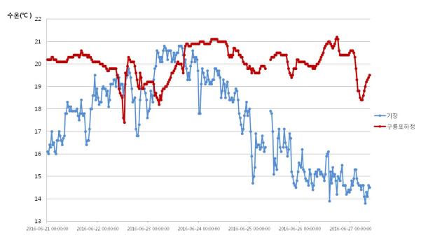 ◦ 국립수산과학원 실시간 해양환경 어장정보 시스템에서 관측한 동해 남부연안의 최근 7일간(6월 21일∼6월 27일)의 수온 변화입니다. ◦ 지난 6월 21일 09시 표층수온은 구룡포하정 20.1℃, 기장 17.8℃ 였습니다. 그러나 현재 27일 09시 기장의 표층수온이 14.5℃로 하강하여 21일에 비해 4℃이상 낮게 나타나고 있습니다. ◦ 부산~울산연안의 어업인께서는 수온 변화에 대한 피해가 발생하지 않도록 양식생물 관리에 주의하시기 바라며, 필요시 주의보 발령토록 하겠습니다. ◦ 냉수대가 발생하는 경우, 수온이 급격하게 변화해 양식생물의 폐사와 연안어업 어획량의 감소뿐 만 아니라 연안에 짙은 해무가 발생해 선박 안전사고가 우려되오니 각별한 주의가 필요합니다.