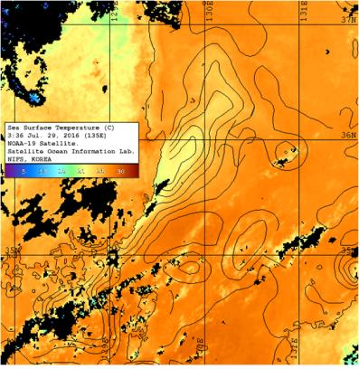 ◦ 아래 그림은 2016년 7월 29일 NOAA 위성에서 관측한 표면수온영상입니다 (검은색은 구름). ◦ 냉수대가 발생한 동해남부해역 연안 표면수온은 22℃이하로, 외해역의 표면수온 24∼25℃에 비해 약 2∼3℃ 정도 낮게 나타나고 있습니다. ◦ 한국해양자료센터 및 한국수력원자력 실시간 관측정보시스템에서 관측한 동해남부해역 표층 수온은 기장 20.3℃, 울기 17.0℃, 고리 16.1℃, 진하 16.2℃, 감포 22.4℃, 포항 24.1℃입니다. ◦ 2016년 7월29일 현재 동해남부해역에 냉수대 주의보(기장, 울기, 고리, 진하)가 발령 중입니다.