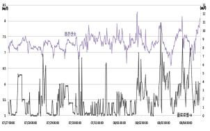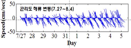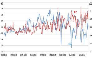 ◦ 국립수산과학원에서는 경남 통영 곤리도 해역에 실시간 적조 관측부이 시스템을 구축(2015.8)하여 운영하고 있음. 실시간 적조 관측부이에는 수온, 염분, 용존산소, 클로로필-a, 해류(유향/유속), 풍향/풍속, 기온 등의 관측 장치가 작동되고 있음) ◦ 2016년 8월 4일 현재, 수온은 26∼27℃, 염분은 33psu 내외, 용존산소는 7∼8mg/L, 클로로필-a는 2∼7㎍/L를 나타내고 있음. 해수의 흐름은 대조기(8월 3일 대조)를 중심으로 강한 왕복성 조류가 나타나고 있으며, 일반적으로 남향류(연안→외해)의 경우 수온이 하강하며, 북향류(외해→연안)의 경우 수온이 상승하는 경향을 보이고 있음. ◦ 국립수산과학원에서는 실시간 적조관측 부이 시스템, 선박/항공기를 이용한 현장조사, 인공위성 및 드론을 활용한 모니터링을 지속적으로 수행하고 있으며, 관측 정보를 신속히 전달토록 하겠음. |