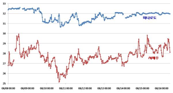 ◦ 해양자료속보 제4931호(2016년 8월 11일)와 관련입니다. ◦ 국립수산과학원에서 운영중인 실시간 해양환경 어장정보시스템에서 얻어진 서제주 및 고흥 외나로도의 염분 변동을 살펴봄. ◦ 2016년 8월 16일 현재, 서제주는 28.1psu 내외, 고흥 외나로도는 31.9 내외의 염분 분포를 나타내고 있음. 이는 외나로도의 경우 지난주에 비하여 1psu 내외 감소한 반면, 서제주의 경우는 지난주와 비슷한 경향을 나타내고 있음. ◦ 하지만, 같은 기간 작년(2015년 8월)에 비하여 서제주의 경우 3psu 내외, 외나로도의 경우 1psu 내외의 낮은 분포를 보이고 있음. ※ 2016년 8월 15일 제주도 서방 30마일 해역의 염분은 22.6∼24.0psu로 나타남 (제 주특별자치도 해양수산연구원 관측 결과) ◦ 현재 제주도 연근해 및 남해 해역에 나타나고 있는 저염분수는 중국 양자강 유출수에 기인한 것으로, 고립된 패치의 형태로 지속적으로 서쪽에서 동쪽으로 접근할 가능성이 있어 이에 대한 지속적인 주의가 필요함. ◦ 제주 및 남해 연안의 양식어장에서는 저염수에 의한 양식생물의 관리에 주의를 기울여 주시고, 지속적으로 국립수산과학원 실시간 수온정보(www.nifs.go.kr/risa/subpage/index.jsp)를 주의깊게 관찰하여 주시기 바랍니다. |