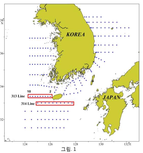 ◦ 국립수산과학원 남해수산연구소에서 수행중인 정선해양관측조사(NSO) 결과입니다. ◦ 2016년 8월 17∼18일 현재 제주도 서방인 313∼314라인(그림 1)에서 관측한 표층염분의 분포는 그림 2와 같습니다. ◦ 제주도 서방해역 모두 26psu 이하의 저염분수가 폭넓게 분포하고 있으며, 제주도 서방 120km 부근에 22psu 내외의 가장 낮은 저염분수가 나타나고 있습니다. ◦ 제주 연안 및 남해 연안의 양식어장은 저염분수의 유입에 의한 피해가 발생하지 않도록 각별한 주의를 당부 드립니다. |