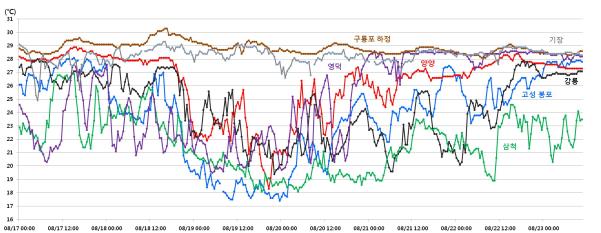 ◦ 아래 그림은 국립수산과학원 실시간 해양환경 어장정보시스템의 표층수온 분석 결과입니다.(2016년 8월 17일, 00:00∼ 2016년 8월 23일, 10:30) ◦ 동해(강원고성, 강릉, 양양, 삼척, 영덕, 구룡포하정, 부산기장)연안에서의 최근 수온 변동 경향은 아래와 같습니다. ◦ 8월 23일 현재 강원고성 27.8℃, 강릉 27.1℃, 양양 27.3℃, 삼척 23.5℃, 경북영덕 28.2℃, 구룡포 하정 28.6℃, 부산기장 28.3℃로 고수온을 보이고 있습니다. ◦ 강원고성, 강릉, 양양, 삼척, 영덕의 경우 바람의 방향에 의해 수온이 낮아졌다(남풍계열 8월19일)가 8월22일부터 다시 고수온(동풍계열) 현상을 보이고 있습니다. ◦ 향후, 동해 연안에서 바람의 방향에 따라 수온의 급하강·급상승 현상이 자주 나타날 가능성이 있으니, 수온변화로 인한 양식생물(연어 및 가리비등)의 폐사가 일어나지 않도록 예의주시 하시고 지속적으로 국립수산과학원 홈페이지 속보정보(http://www.nifs.go.kr/bbs?id=newfish)를 참고하여 주시기 바랍니다. |