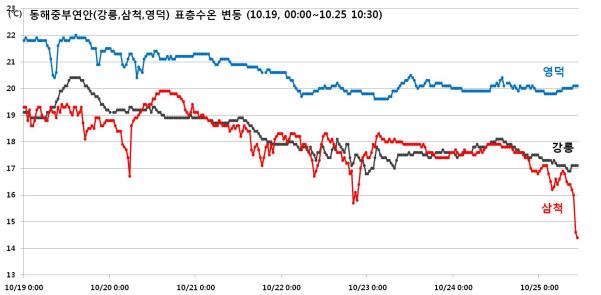 ◦ 국립수산과학원에서 설치 운영하고 있는 실시간 해양환경 어장정보시스템 자료의 분석 결과, 동해 중부해역 (강릉, 삼척, 영덕)에서의 최근 수온 변동 경향은 아래와 같습니다(10월19일∼10월25일). ◦ 현재(10월25일), 강릉 17.1℃, 영덕 20.1℃ 수온을 보이나, 삼척 수온은 14.4℃로 급하강 하고 있습니다. 이는 10월 24일에 비하여 2∼3℃ 하강변동을 보인 것이며, 작년 같은 시기 삼척 수온 17℃ 에 비해 3℃ 낮게 나타고 있습니다.