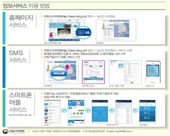 ◦ 서해 및 남해의 양식어업인께서는 양식생물들의 저수온에 의한 피해 예방에 만전을 기해 주시기 바라며, 국립수산과학원에서 제공하는 실시간 수온 정보 서비스를 적극 활용하여 수온 변동 경향에 주의를 기울여 주시기 바랍니다. |