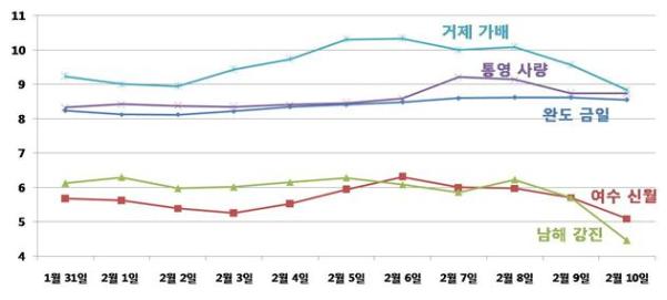 ◦ 국립수산과학원의 실시간 해양환경 어장정보시스템 관측 자료 분석 결과, 남해의 완도 금일, 여수 신월, 남해 강진, 통영 사량, 거제 가배에서의 최근 10일간 수온 변동 경향은 아래와 같습니다 (1.31∼2.10).