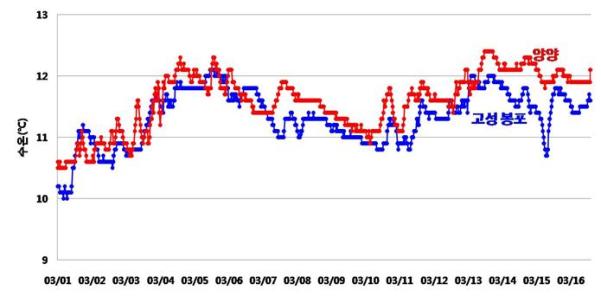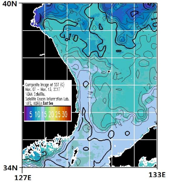 ◦ 3월 17일부터 24일까지 개최되는 “어린연어 방류사업”에 본 수온 정보를 활용하시기 바랍니다. ◦ 국립수산과학원의 실시간 해양환경 어장정보시스템 관측 자료 분석 결과, 강원도 양양 및 고성 봉포의 최근 16일간 수온 변동 경향은 아래와 같습니다 (3.1∼3.16). ◦ 3월 16일 현재, 강원 양양과 고성 봉포의 수온은 12℃ 내외를 보이고 있습니다. 이는 3월 초순의 10℃ 내외의 수온에서 약 2℃ 정도 상승한 경향을 나타내고 있습니다. ◦ 3월 7일부터 13일까지 일주일간 인공위성 정보를 합성한 표면수온 분포는 아래와 같습니다. ◦ 강원 양양∼고성 연안의 수온은 11∼12℃ 내외를 나타내고 있으며, 외해로 갈수록 표면수온이 약간 감소하는 경향을 보이고 있습니다.