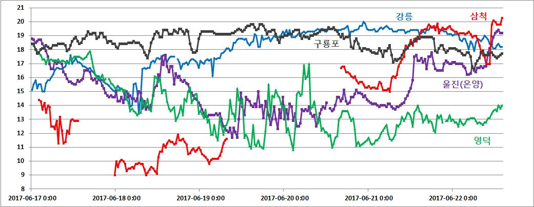 O 국립수산과학원 해양자료속보 제5104호(2017.6.19.)호와 관련입니다. O 국립수산과학원의 실시간 해양환경 어장정보시스템 관측 자료 분석 결과, 동해 중부 연안 (강릉, 삼척, 울진(온양), 영덕, 구룡포)의 표층수온 변동은 다음과 같습니다(2017.6.17∼6.22). O 6월 22일 현재, 영덕은 13∼14℃를 나타내고 있는 반면, 강릉∼울진 및 구룡포 연안은 18∼20℃ 내외의 분포를 보이고 있습니다. O 대부분 동해 연안의 수온이 정상수준을 회복하였지만, 영덕 연안은 지속적으로 냉수대의 영향을 보이고 있어, 수온 변화에 각별한 관심이 필요합니다. O 냉수대 발생시에는 양식생물의 생리생태 변화, 균형 소실 등에 의하여 생존에 영향을 줄 수 있으므로, 동해중부 연안의 양식장에서는 양식생물의 피해 예방에 만전을 기해 주시기 바랍니다.