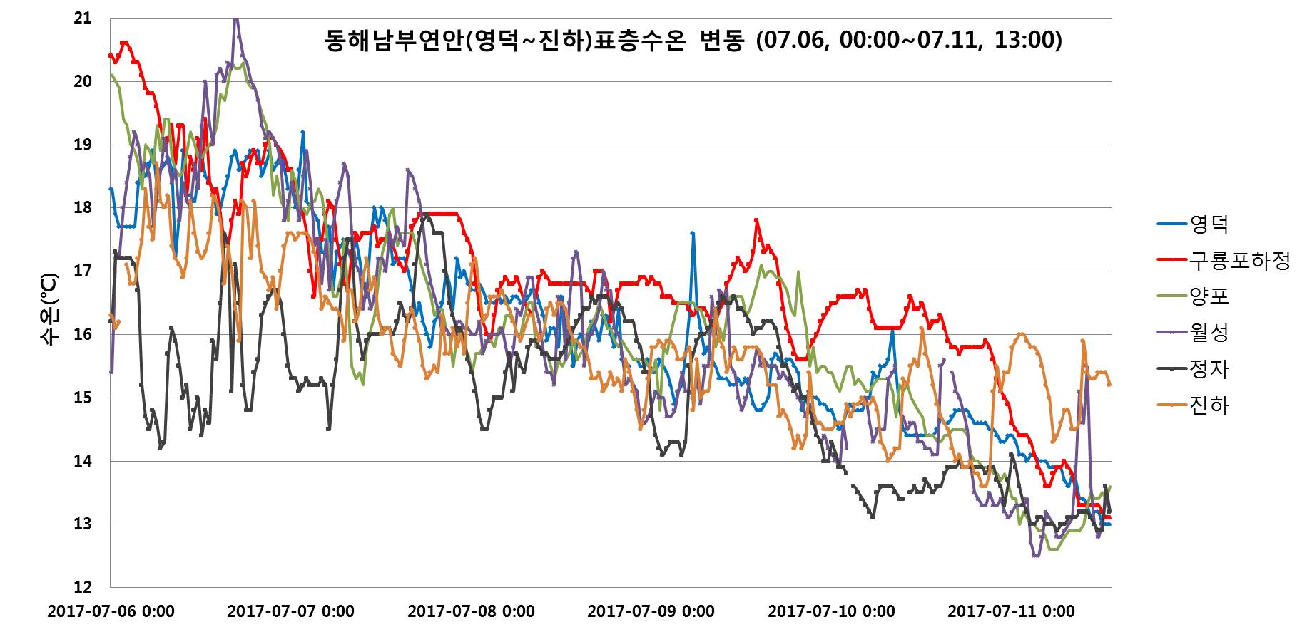 ○ 국립수산과학원 실시간 해양환경 어장정보시스템 관측자료 분석결과, 동해 중·남부연안 (영덕, 구룡포 하정, 양포, 월성, 정자, 진하)의 표층수온 변동은 다음과 같습니다(2017.7.6.∼7.11). ○ 7월 11일 13시 현재 동해 중·남부연안의 표층수온은 13.0∼13.6℃로 근해역 21∼23℃에 비해 7∼10℃ 정도 낮게 나타나며, 지난 7월 6일에 비해 5~7℃ 낮게 나타나 냉수대 주의보를 발령 합니다. * 7월 6일 13시 표층수온은 영덕 18.4℃, 구룡포 하정 18.4℃, 양포 19.0℃, 및 월성 19.3℃ 였습니다. ○ 냉수대가 발생하는 경우, 수온이 급격하게 변화해 양식생물의 폐사와 연안어업 어획량의 감소뿐 만 아니라 연안에 짙은 해무가 발생해 선박 안전사고가 우려되오니 각별한 주의가 필요하며. 어업인께서는 수온 변화에 대한 피해가 발생하지 않도록 양식생물 관리에 주의하시기 바랍니다.