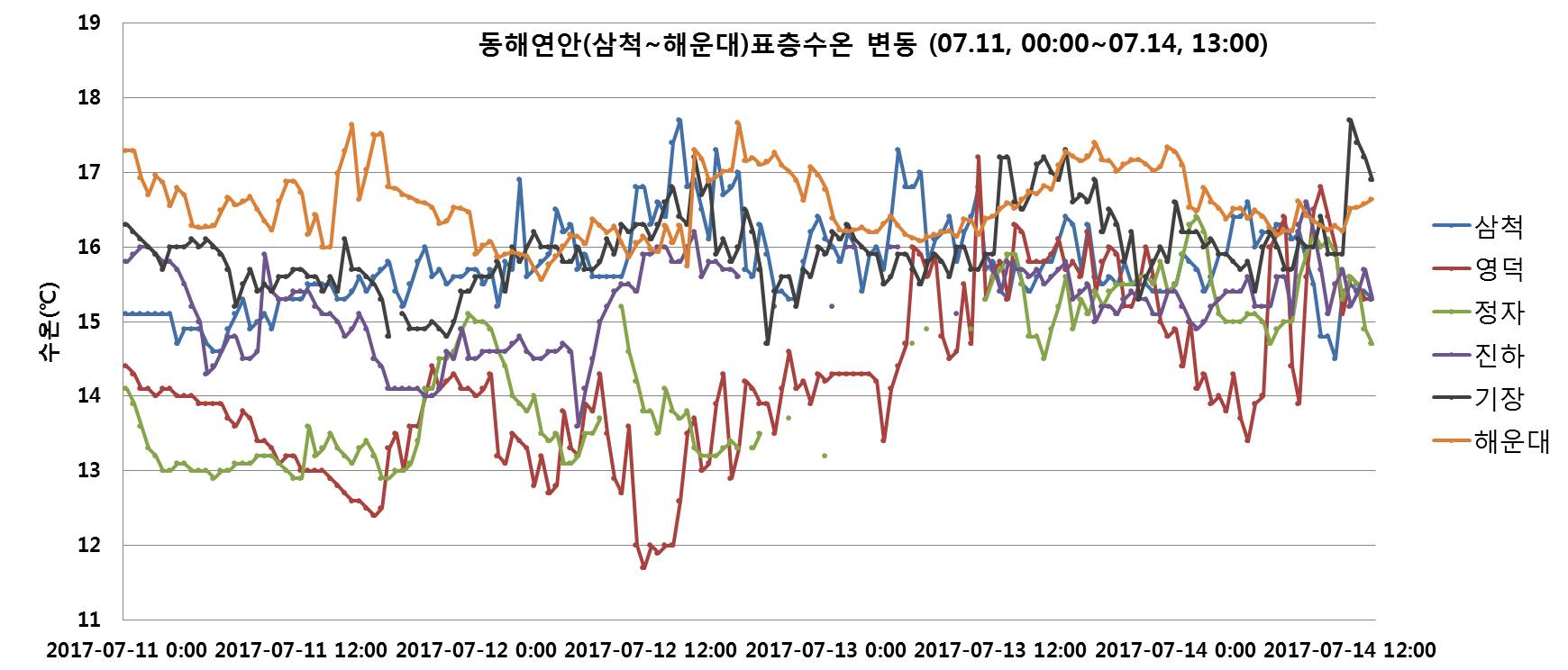○ 국립수산과학원 실시간 해양환경 어장정보시스템 관측 자료와 국립해양조사원 실시간 해양관측정보시스템(해양관측부이) 분석결과, 동해 중·남부연안 (삼척, 영덕, 정자, 진하, 기장, 해운대)의 표층수온 변동은 다음과 같습니다(2017.7.11.∼7.14).
