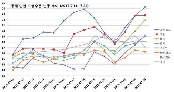 ○ 하지만, 영덕∼기장 연안의 경우, 16∼19℃ 내외의 수온으로 아직 약한 냉수대가 존재하고 있는 것으로 판단하여 냉수대주의보를 유지합니다. * ○ 해양자료속보 제5120호(2017.7.11.), 제5121호(2017.7.14.) 및 제5122호(2017.7.14.)호와 관련입니다. ○ 국립수산과학원의 실시간 해양환경 어장정보시스템 관측 자료 분석 결과, 동해 연안(고성 봉포, 강릉, 삼척, 영덕, 구룡포, 포항 양포, 울산 진하, 기장)의 표층수온은 다음과 같습니다(2017.7.11∼7.24). ○ 냉수대는 남풍 계열 바람이 나타나는 8월까지 소멸과 생성을 반복하므로, 국립수산과학원의 실시간 해양환경 어장정보시스템 및 동해 연안 냉수대 예측정보 시스템(http://kodc.nifs.go.kr/rocps/index2.jsp)의 실시간 수온 및 예측 수온 정보에 관심을 기울여 주시기 바랍니다.