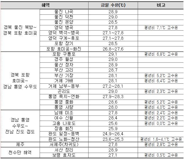 - 경북 울진 북방~경북 포항 호미곶 : 현재 27~29℃로 전일에 비하여 영덕군의 수온이 상승되고 있음.