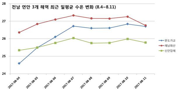 ο 국립수산과학원 RISA 관측 자료 분석 결과, 전남 연안 3개 해역(완도 가교, 해남 화산, 신안 압해)의 일평균 표층수온은 다음과 같습니다 (2017.8.4∼11).