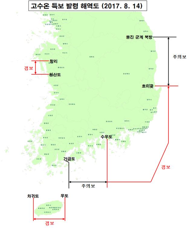 - 고수온 경보 발령 해역 (2017. 8. 6, 10:00) :