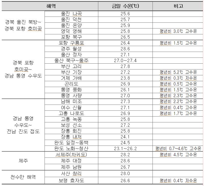 - 경북 포항 호미곶~경남 통영 수우도 : 현재 24~28℃. 전일과 비슷하거나 소폭 수온이 하강하였음.