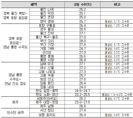 - 경북 포항 호미곶~경남 통영 수우도 : 현재 24~28℃. 전일과 비슷하거나 소폭 수온이 하강하였음.