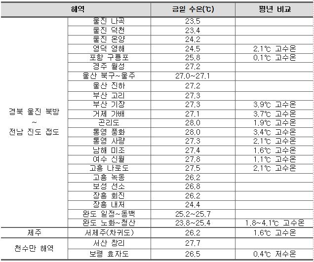 - 경북 울진 북방~전남 고흥 거금도 서방 종단(득량만 포함) : 현재 24~28℃. 전일 대비 통영~여수 내만을 중심으로 상대적 높은 수온(27~28℃) 보임.