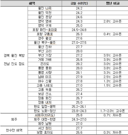 - 경북 울진 북방~전남 고흥 거금도 서방 종단(득량만 포함) : 현재 24~28℃ 내외. 전일과 거의 비슷한 수온을