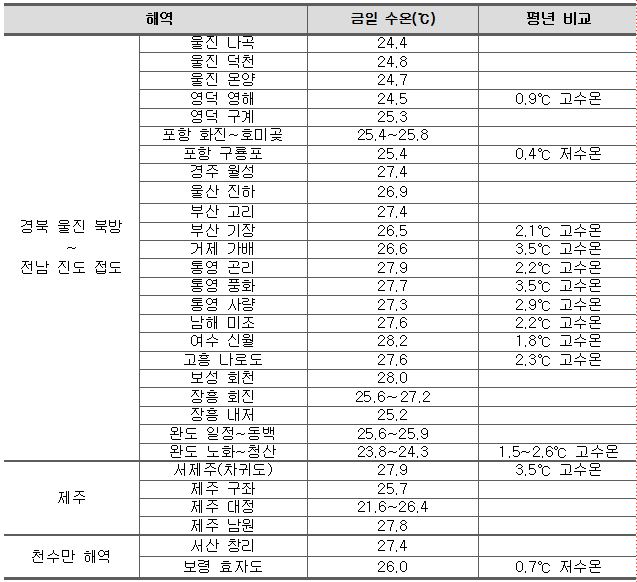 - 경북 울진 북방~전남 고흥 거금도 서방 종단(득량만 포함) : 현재 24~28℃. 전일과 거의 비슷한 수온을 보이나, 통영~여수 내만을 중심으로 27.3∼27.9℃ 내외 수온을 보임.