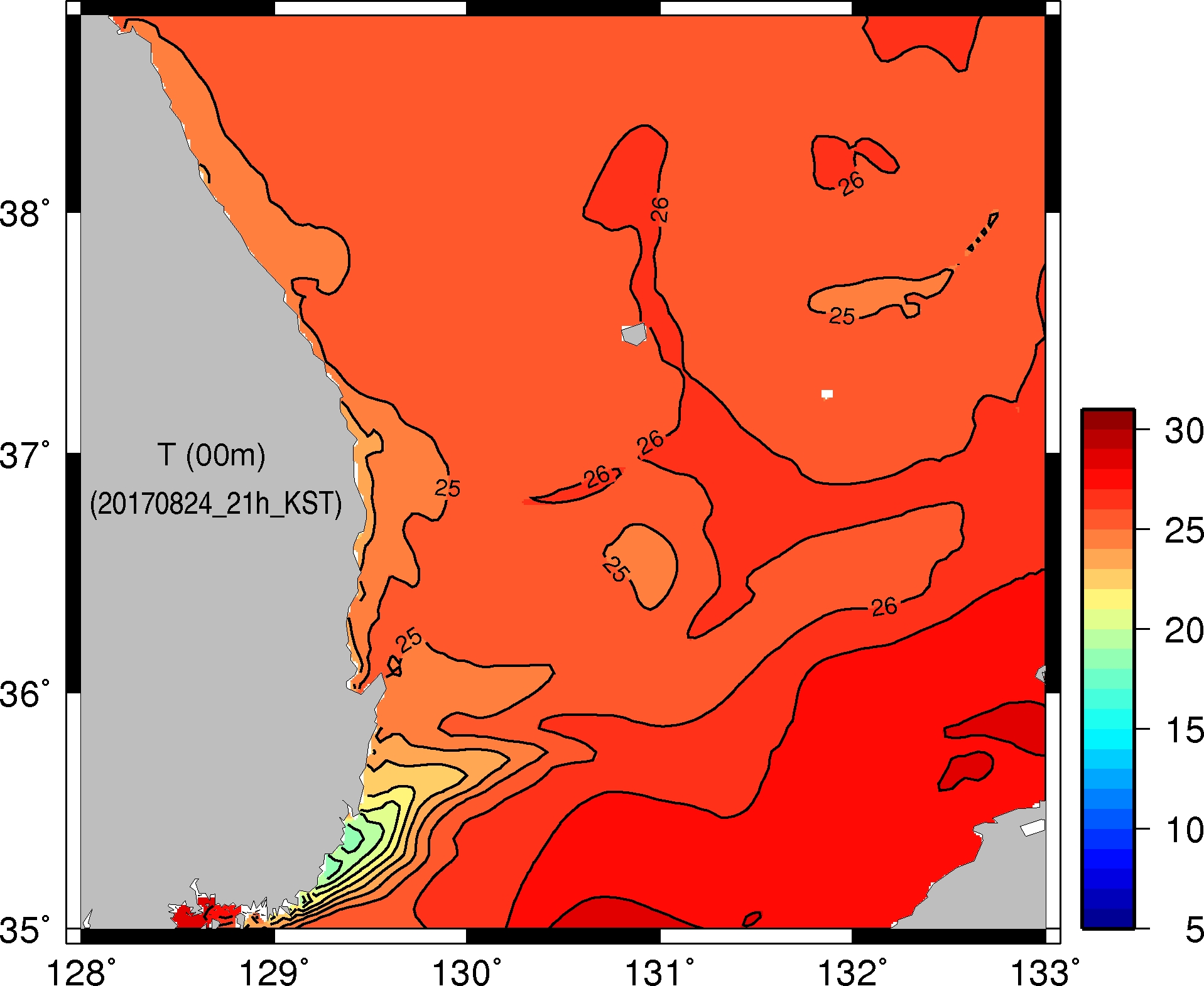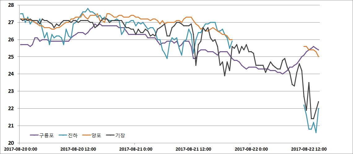 ○ 국립수산과학원의 RISA 관측 자료 분석 결과, 동해남부 연안의 표층수온은 다음과 같습니다 (2017.8.20.∼8. 22).