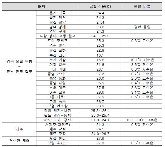 Ο 진행상황 - 전남 고흥 거금도∼경남 거제시 남부면 : 통영~여수 및 내만을 중심으로 26.0∼28.6℃ 내외로 여전히 고수온을 보임. - 제주도 연안 : 21~25℃ 내외를 보임. 서제주를 중심으로 전일에 비하여 수온이 3~4℃ 하강. - 천수만 해역 : 27∼28℃ 내외를 보임. ※ 부산연안을 중심으로 냉수대의 영향으로 15~17℃ 수온을 보이고 있으며, 울산 이북 연안은 냉수대의 영향에서 벗어나고 있음. Ο 특보상황 - 고수온 주의보 발령 해역 : · 충남 서산시 창리 남측 횡단~충남 보령시 원산도 남측 횡단(2017. 8. 16, 16:00) · 제주 차귀도 서방 종단~제주 우도 동방 종단(2017. 8. 16, 16:00) · 전남 고흥 거금도 서방 종단(득량만 포함)~경남 거제시 남부면 여차 종단(2017. 8. 22, 16:00) Ο 금후전망 - 남해중부해역(장흥, 고흥, 여수) 및 경남 연안은 고수온이 유지될 것으로 예상. 기온이 하강하는 9월초 이후 수온도 서서히 하강될 것으로 예상됨. - 남해서부해역(진도, 완도 등)은 다음주 소조기로 진도냉수대가 일시적으로 축소되어 수온 상승 가능성이 있을 것으로 판단됨. - 동해남부연안은 26일 오후부터 북풍 계열의 바람에 의해 냉수대가 소멸되어, 27일 이후 평년 수온으로 회복 될 것으로 예상됨. - 제주연안은 서제주를 중심으로 수온이 급격히 하강하였으나, 향후에도 수온의 변동이 클 것으로 예상됨. Ο 당부사항 - 거제∼부산~울산 연안은 26~27일 사이 냉수대 소멸에 의한 수온 급상승이 예상되니 양식생물 피해 예방에 주의를 기울여 주시기 바랍니다. ※ 동해남부(거제∼진하) 해역 냉수대 주의보 발령(2017. 8. 23, 해양자료속보 5153호 및 8. 25, 해양자료속보 5155호 참고 - 서제주 연안(대정, 한경 등)은 서제주를 중심으로 수온변동이 크게 나타나고 있어, 양식장 사육관리 및 수온 변화에 관심을 기울여 주시기 바랍니다. - 여수~통영 내만 해역은 특히 양식장 사육 관리 및 수온 예찰에 철저를 기하여 주시기 바랍니다.
