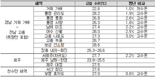 - 전남 고흥 거금도∼경남 거제시 남부면 : 통영~여수 및 내만을 중심으로 26.8∼28.2℃ 내외로 여전히 고수온을