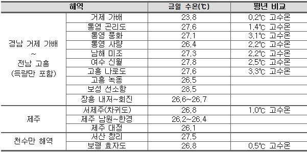 - 전남 고흥 거금도∼경남 거제시 남부면 : 통영~여수 및 내만을 중심으로 26.4∼28.5℃ 내외로 여전히 고수온을 보임.