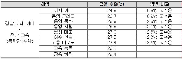 - 전남 고흥 거금도∼경남 거제시 남부면 : 전일에 비하여 대부분 해역에서 0.5℃ 내외 수온이 하강하여 24~27℃ 내외의 수온을 보임.