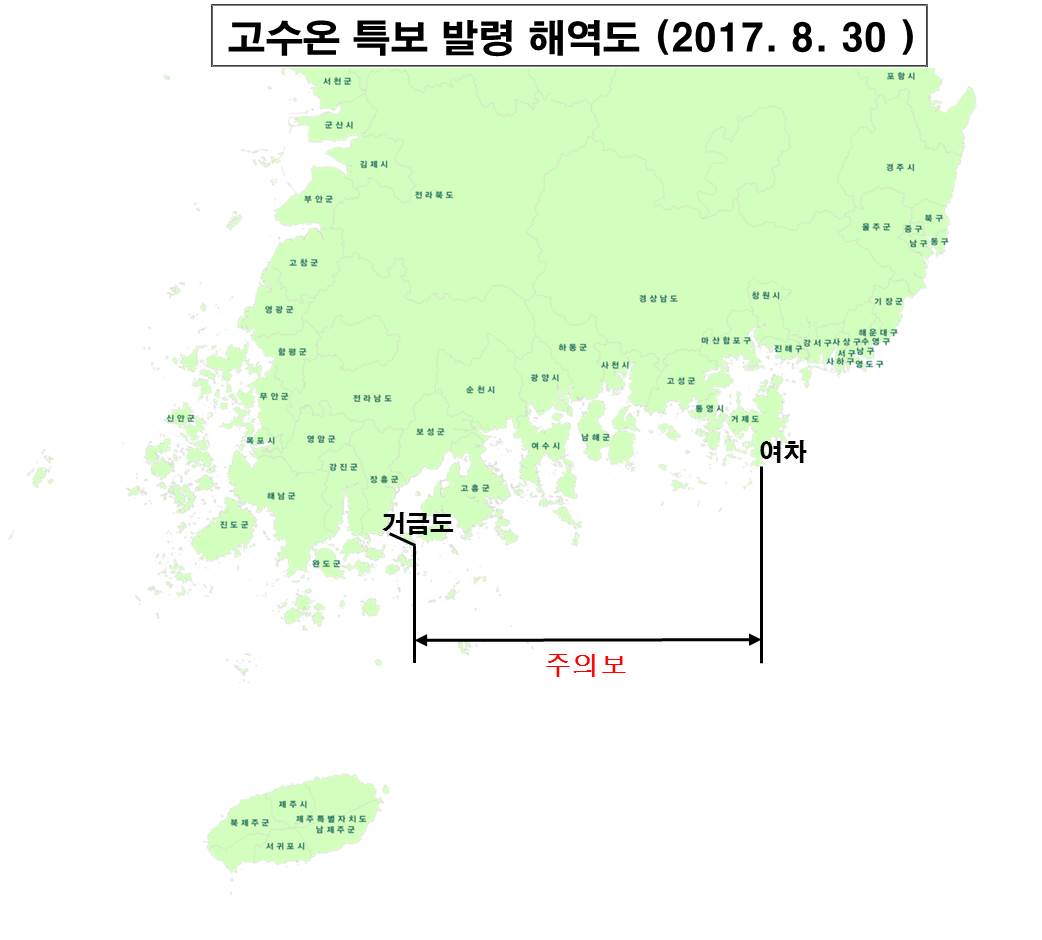 - 고수온 주의보 발령 해역 (2017.8.22., 16:00) :