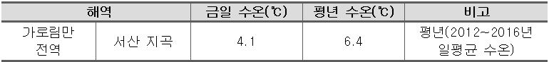 - 금일 현재 충남 가로림만 수온은 평균 4.1℃(2.7~6.4℃ 범위)를 나타내고 있음.