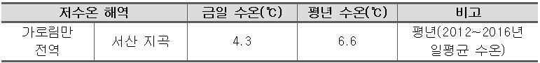 - 충남 가로림만 해역 양식인께서는 저수온 대응에 철저를 기해주시기 바람(붙임 양식장 관리요령 참조). 특히, 일 최저수온이 발생하는 시간에 주의를 요함.