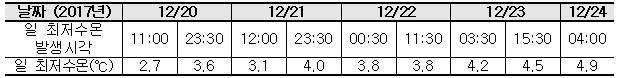 ○ 금후전망 가능성이 있음. ○ 당부사항 또한, 일 최저수온이 발생하는 시간에 주의를 요함. ○ 특보상황