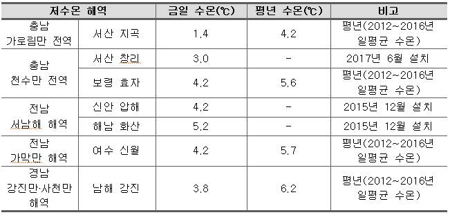 - 저수온 주의보 발령 해역 :