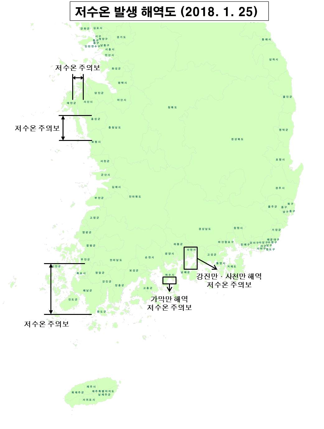 - 전남 득량만 입구(장흥 회진) 6.0~7.5℃, 전남 여자만 입구(나로도) 7.0~7.5℃ 등을 나타내고 있어 주의보 발령 기준보다 높지만, 지속적으로 수온이 하강하고 있어 주의가 요구됨.
