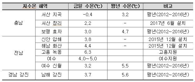 - 전남 득량만 입구(장흥 회진) 5.0~6.5℃, 전남 여자만 입구(나로도) 6.0~7.0℃, 경남 진해만 동측(통영 광도면~가조도) 5.5~6.0℃ 등을 나타내고 있어 주의보 발령 기준보다 높지만, 수온 하강이 예상되니 주의가 필요함.