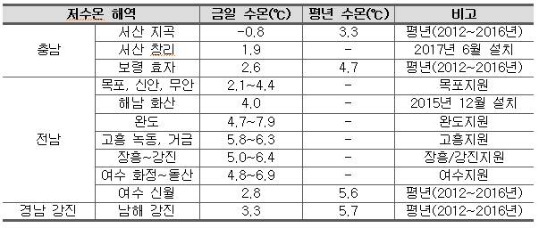 - 전남 득량만 입구(장흥 회진) 5.0~6.5℃, 전남 여자만 입구(나로도) 5.5~6.5℃, 경남 진해만 동측(통영 광도면~거제 가조) 5.0~6.0℃ 등을 나타내고 있어 주의보 발령 기준보다 높지만, 수온 하강이 예상되니 주의가 필요함.