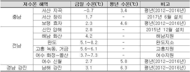 - 전남 득량만 입구(장흥 회진) 5.6~7.2℃, 전남 고흥 나로도 5.7~6.1℃, 경남 진해만 동측(통영 광도면~거제 가조) 5.1~5.5℃ 등이며, 이후 수온 하강이 예상되니 주의가 필요함.