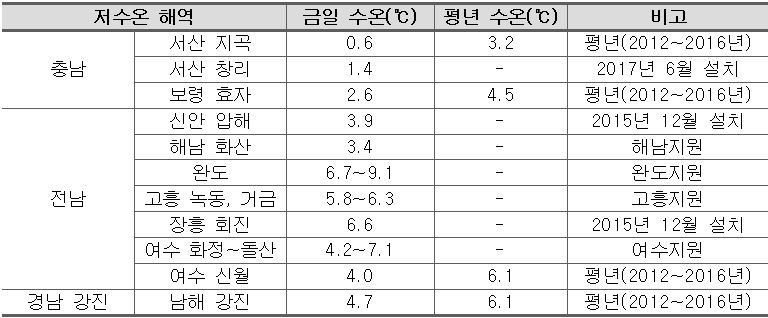 - 전남 득량만 입구(장흥 회진) 6.2~7.2℃, 전남 고흥 나로도 5.3~7.9℃, 경남 진해만 동측(통영 광도면~거제 가조) 5.0~5.9℃ 등으로 평년 대비 저수온 경향이 지속되고 있어 주의가 필요함.