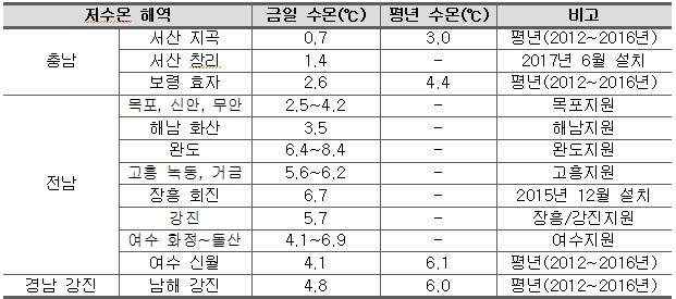 ※ 전남 해양수산과학원 예찰결과 전남해역은 2.5~8.4℃를 나타냄.