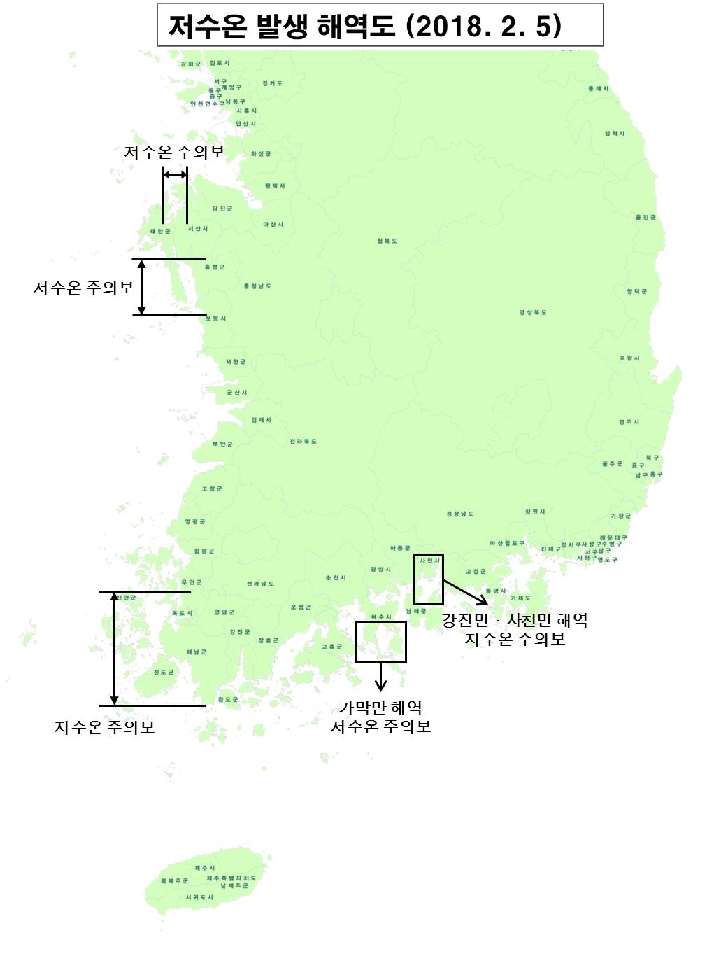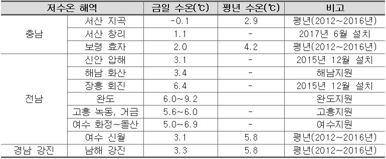 - 전남 득량만 입구(장흥 회진) 5.7~7.4℃, 전남 고흥 나로도 4.7~5.2℃, 경남 진해만 동측(통영 광도면~거제 가조) 4.4~4.9℃ 등으로 지속적으로 낮은 수온이 나타나 주의가 필요함.
