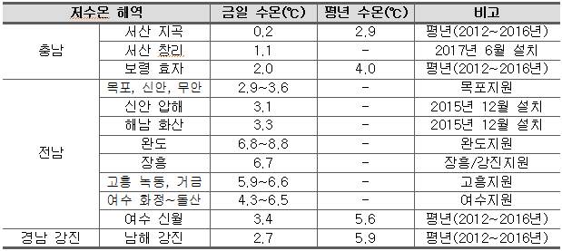 - 전남 득량만 입구(장흥 회진) 5.2~7.7℃, 전남 고흥 나로도 4.7~5.8℃, 경남 진해만 동측(통영 광도면~거제 가조) 4.3~4.7℃ 등으로 낮은 수온이 나타나 주의가 필요함.